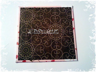 6. Jetzt beziehen wir die Seitenteile mit Design-Papier. Das Paper sollte rundum 1 cm größer sein. Pinselt eine Seite der Graupappestücke mit Buchbinderleim ein und klebt es auf das Papier. Hierbei darauf achten, dass ihr zum Linken und Unteren Papierrand 1 cm abstand lasst. Dieser Rand wird nachher umgeschlagen! Nun klebt ihr das zweite Stück Graupappe auf das Papier. Dabei zum ersten Stück einen kleinen Abstand lassen. Ich mache es mir da einfach und klemme dazu ein Stück Graupappe zwischen die beiden Stücke, damit ich so den richtigen Abstand habe. Das macht ihr dann auch mit den übrigen Stücke. Es sollte nun bei euch so aussehen:
